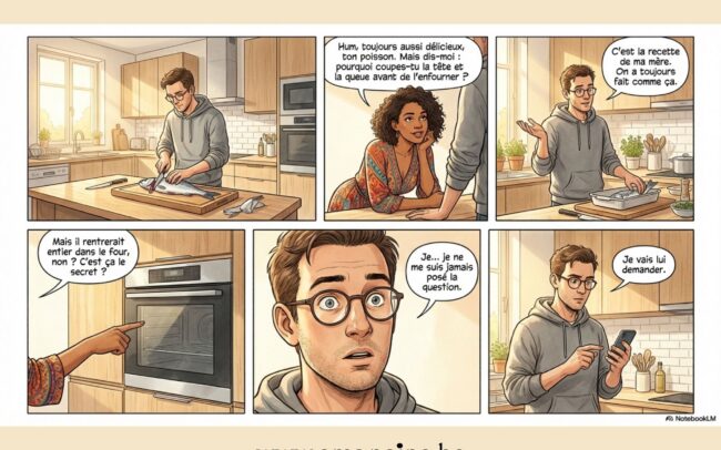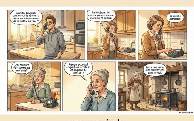 – Maman, j’ai une question: pourquoi coupe-t-on la tête et la queue du poisson avant de le mettre au four ?