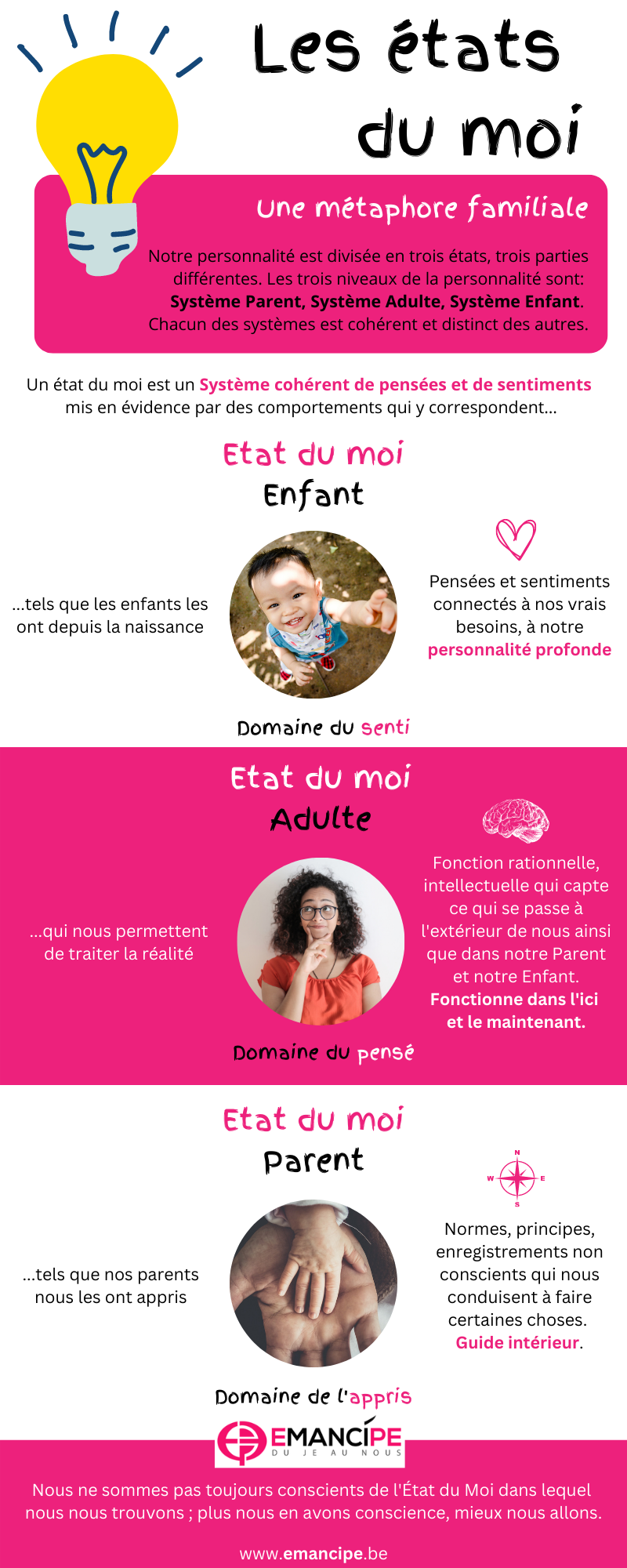 Développée par le psychiatre canado-américain Eric Berne dans la fin des années 50, l’Analyse Transactionnelle est une approche pratique de la personnalité, à la fois dans son fonctionnement interne et dans ses relations avec autrui. Et l’un des concepts clef de l’Analyse Transactionnelle dispose que notre personnalité est divisée en trois états, trois parties distinctes et différentes. Tout d’abord la personnalité que nous avons de naissance et qui est présente toute notre vie: l’Enfant. Ensuite, une autre personnalité se fait jour, celle qui est acquise par l’éducation et que nous renforçons par des valeurs qui nous semblent vraies: c’est le Parent. Enfin, la troisième personnalité qui est celle que l’on tend à devenir: l’Adulte. En résumé: « L’enfant demande, l’adulte prend, le parent donne, » comme l’écrit Giulio Cesare Giacobe dans son ouvrage « A la recherche des câlins perdus. »