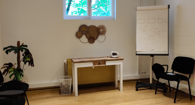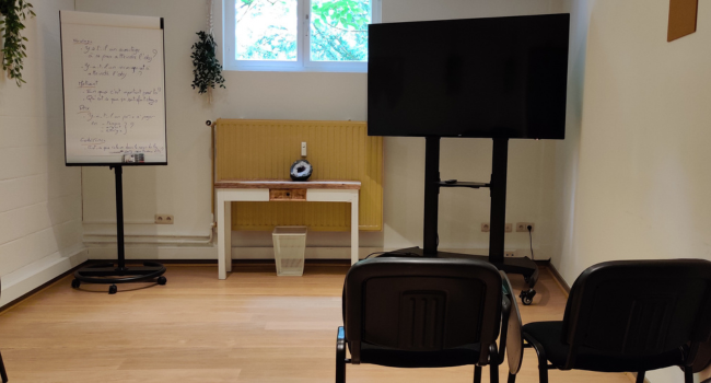 - Formule clés en main (tables, sièges, boissons chaudes à disposition, paperboard, rétroprojecteur, grande TV connectée)